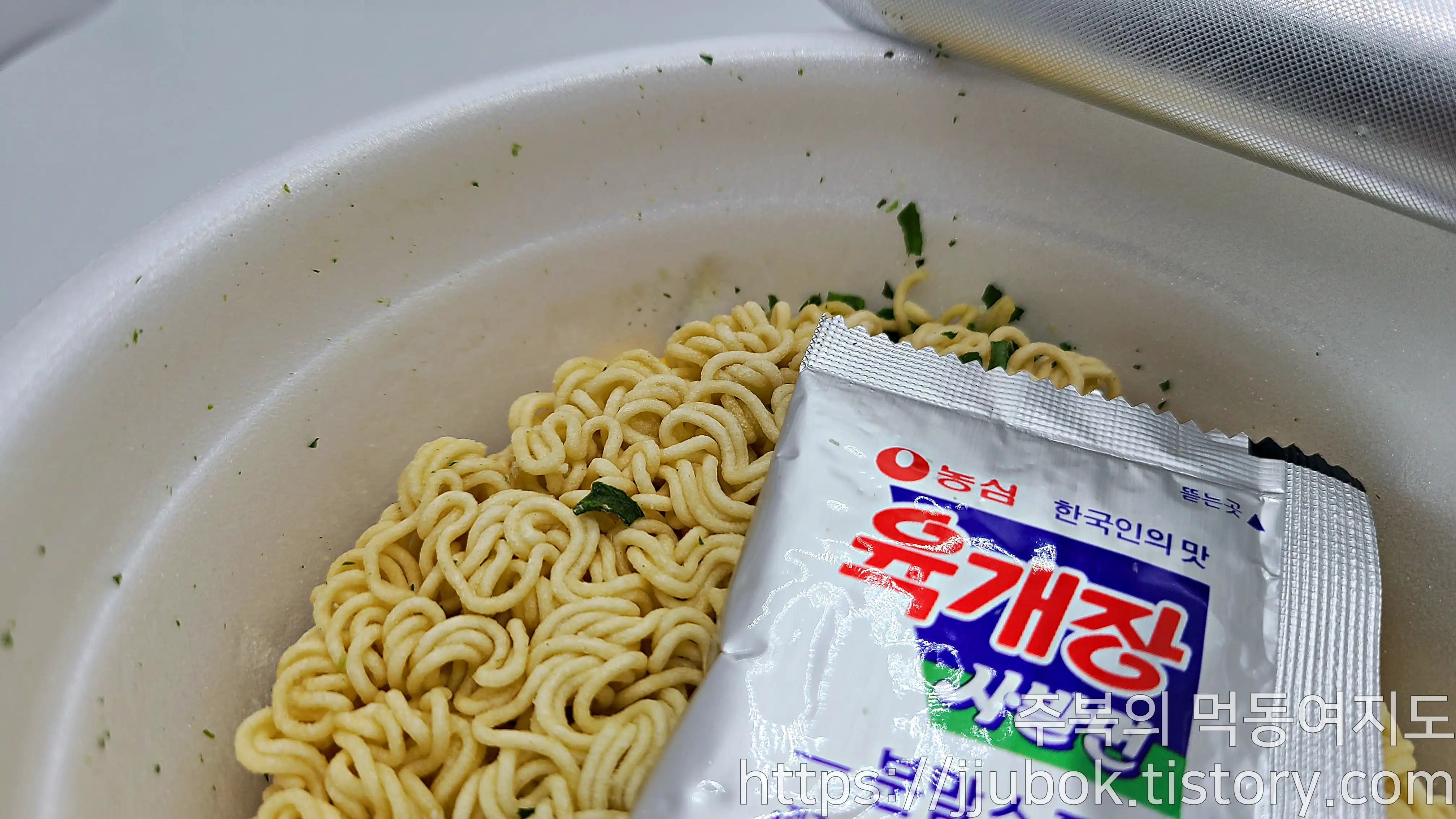 육개장 사발면 뚜껑에 3분이라고 적혀있긴 하지만.. 3분을 정확하게 전부 채우면 안 그래도 얇은 면발이 쉽게 불어버려.. 저는 대략 1분 30초 정도 기다렸다가 면이 스낵이지만 스낵같지 않을때쯤 먹기 시작합니다..ㅎㅎ
