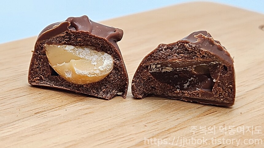 개인적인 생각이지만 마카다미아는 생각보다 뻣뻣하지 않고 부드럽게 이빨을 파고들어 가는 편이긴 한데 초콜릿이 살짝 딱딱한 편이어서 이빨이 약하신 분이라면 드실 때 주의가 필요하다는 생각이네요.