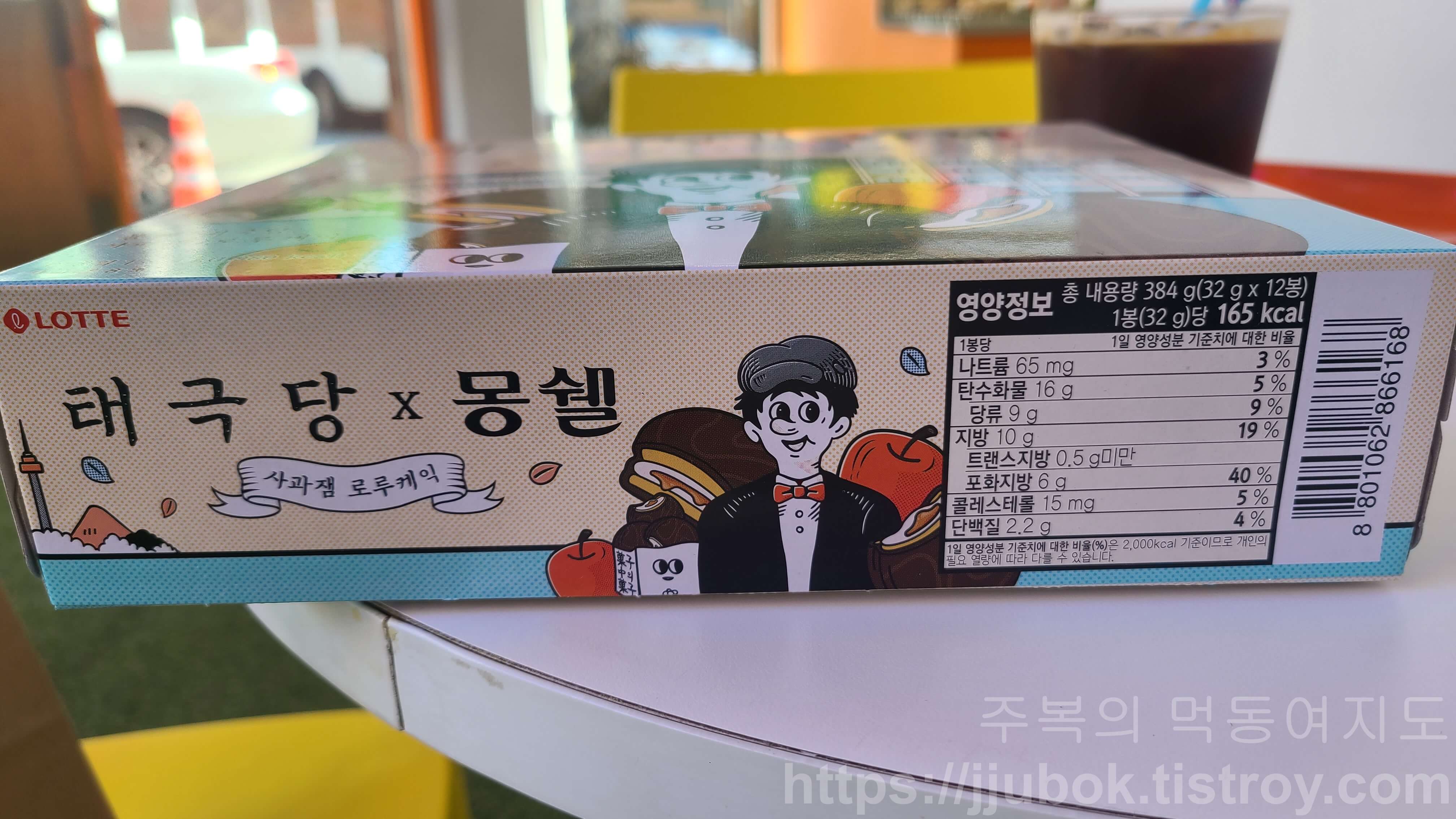 | 몽쉘 태극당 사과잼 로루케익 12봉입, 384g (1,980kcal ) 사과잼 8% 몽슐랭로드 프로젝트 2탄 with 태극당 "나를위한 힐링디저트 몽쉘, 디저트샵과 만나다" |
