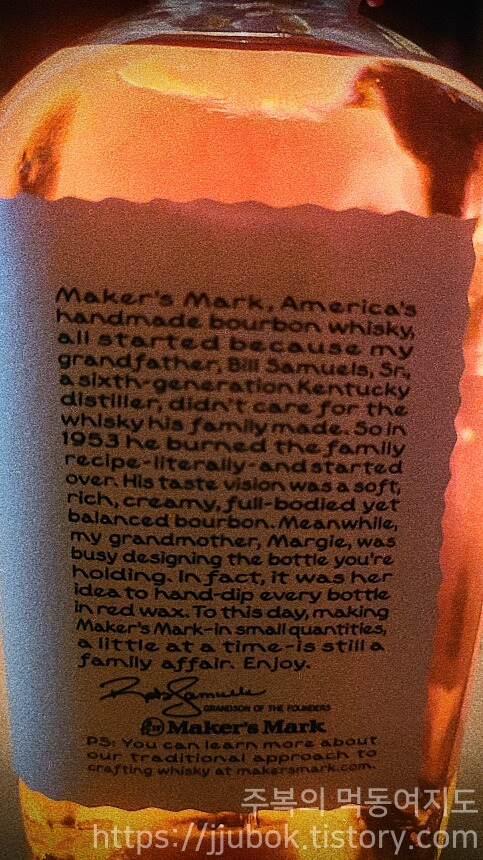 병에 새겨진 실링왁스처럼 보이는 메이커스 마크의 문장에 적혀있는 의미가 담겨있는데 (잘은 안보이시겠지만) Samuels(새무얼스) 가문의 S, IV라고 적혀있는 것은 4대째 운영하고 있다는 뜻이고 문장 좌측하단에 별모양이 그려져 있는데 이것은 메이커스 마크의 농장인 Star hill의 별을 딴 것으로 되어있습니다.