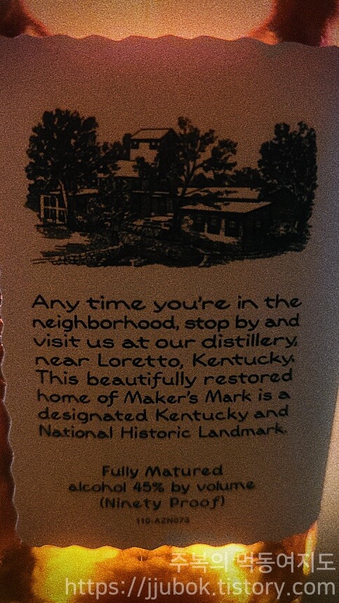 미국 켄터키 주 로레토 근처에 계신다면 증류소에 들려주세요. 아름답게 복원된 Maker's Mark의 집은 켄터지 주의 지정된 역사적 랜드마크입니다. 완전 숙성 알코올 45% (ninety proof - 미국식 계산법으로 45도의 위스키라고 생각하시면 편하겠습니다.) -우측 사진의 Maker's Mark 설명 |