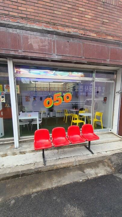 카페 외부에는 플라스틱 의자가 배치되어 있어