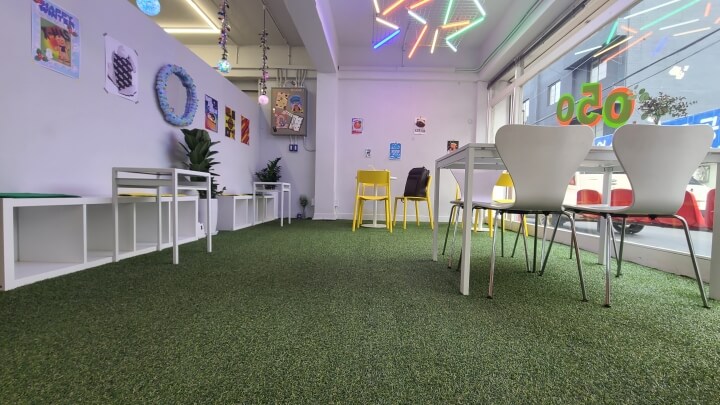 바닥에 설치된 인조잔디와 곳곳에
