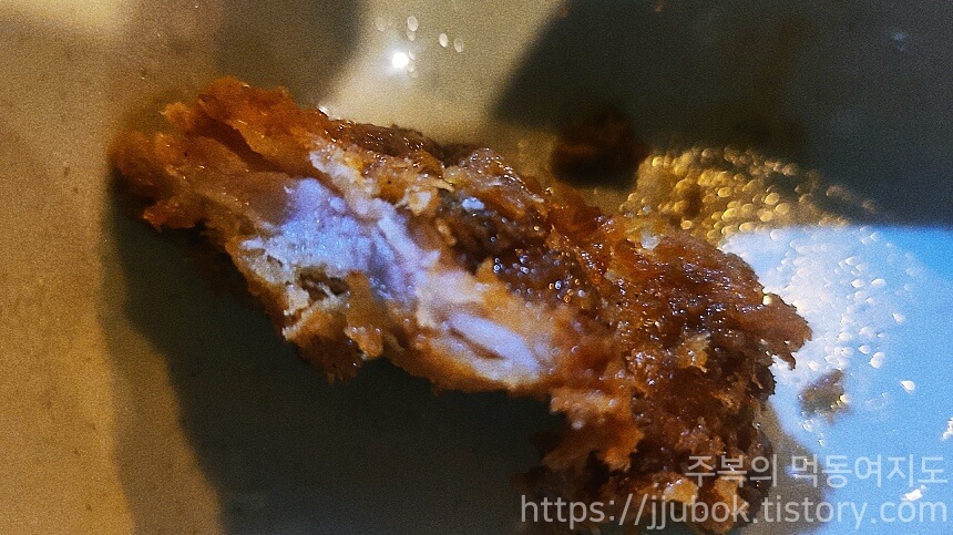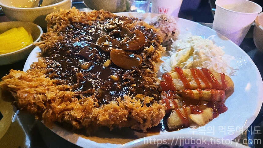 다른 곳에서 잔뜩 먹고 온 상태에서 배가 많이 부른 편이었는데 바삭하게 튀겨진 왕돈까스의 비주얼을 보고는 이전에 먹었던 메뉴들을 머릿속에서 지워버리기에 충분했습니다.