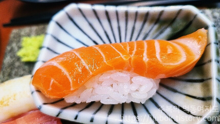 계속해서 연어 초밥부터 하나씩 먹었을때 입안에서 쫀득한 식감이 느껴지며 살살 녹는 맛은 젓가락을 연달아 움직이고 맛보며 계속 맛있다고 감탄하게 만들었습니다.