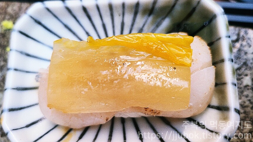 이번 오마카세 판초밥에서는 황금광어가 특별 게스트로 출연하였고.. 입 안에서 꽉 차도록 쫄깃했던 식감은 좀처럼 긴 여운을 남긴 맛이었네요.