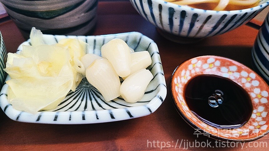 테이블 한쪽에는 생강, 락교, 간장 통이 비치되어 있어서 종지 그릇과 밑반찬 접시에 먹을 만큼만 알맞게 담아주시면 되겠습니다.