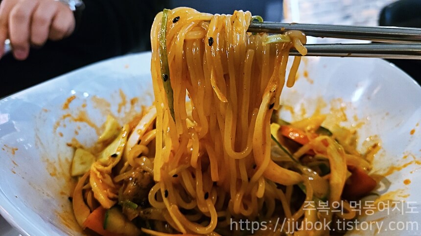 골쫄면의 핵심인 양념에서는 묘하게 달달하면서 중독적인 맛이 느껴지는데 한입을 먹고 입 안에서 골쫄면이 춤추고 있는데 한 젓가락 또 들고 싶다는 충동에 사로잡히는 맛이었네요 ㅎㅎ