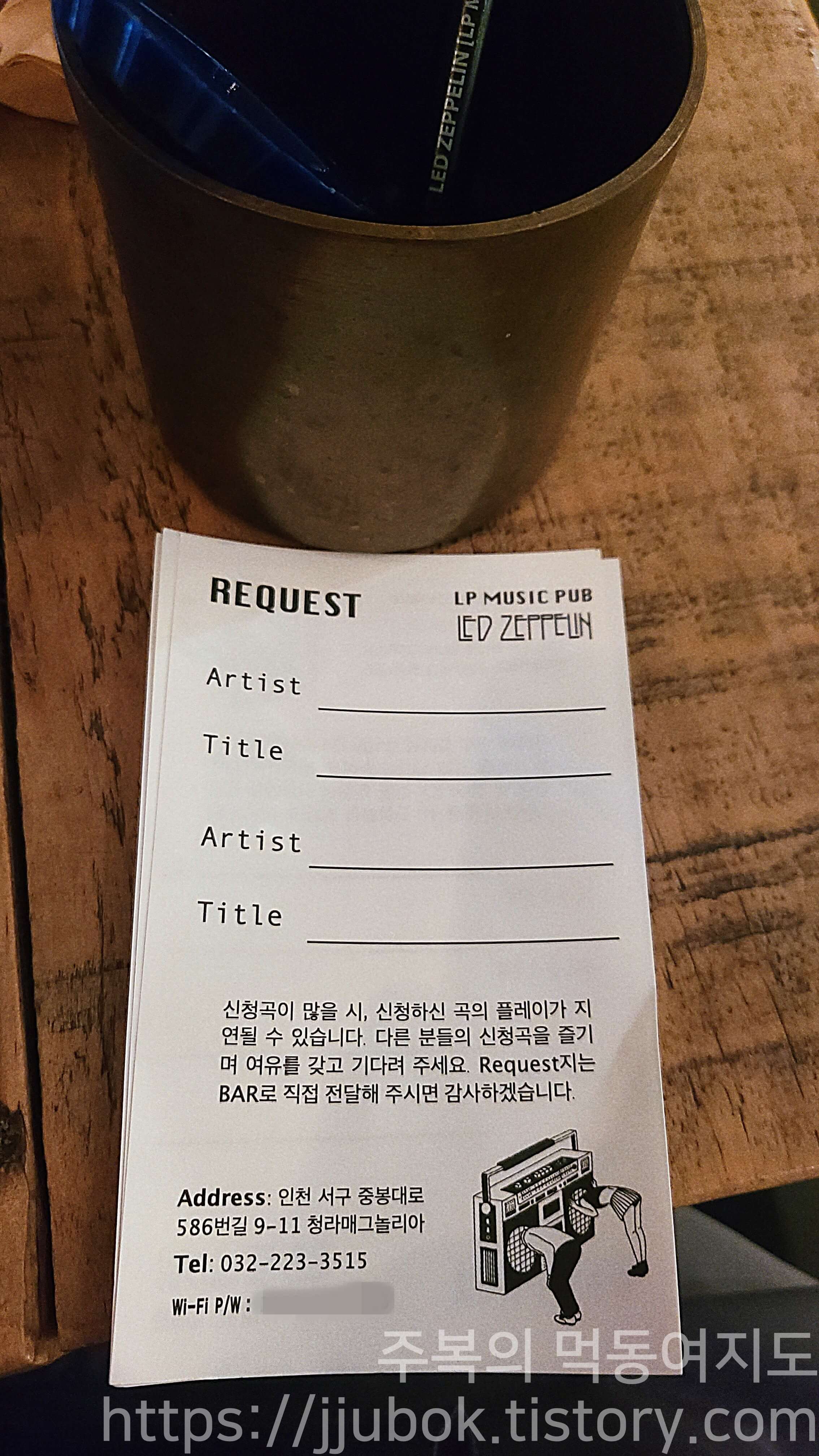 분위기 좋은 LP펍인 인천 서구 청라에 위치한 레드 제플린(led Zeppelin) 편의 주복이었습니다.