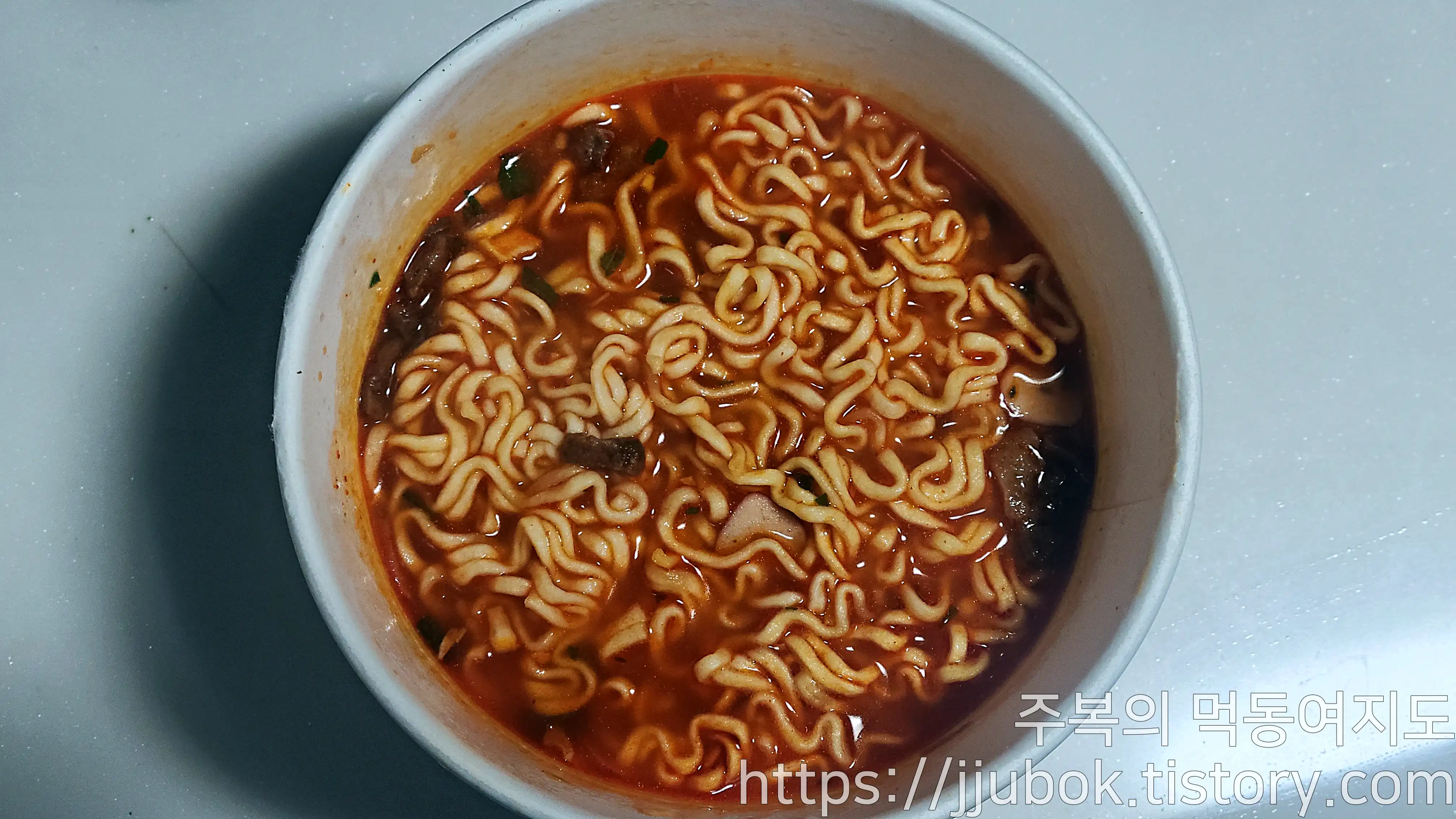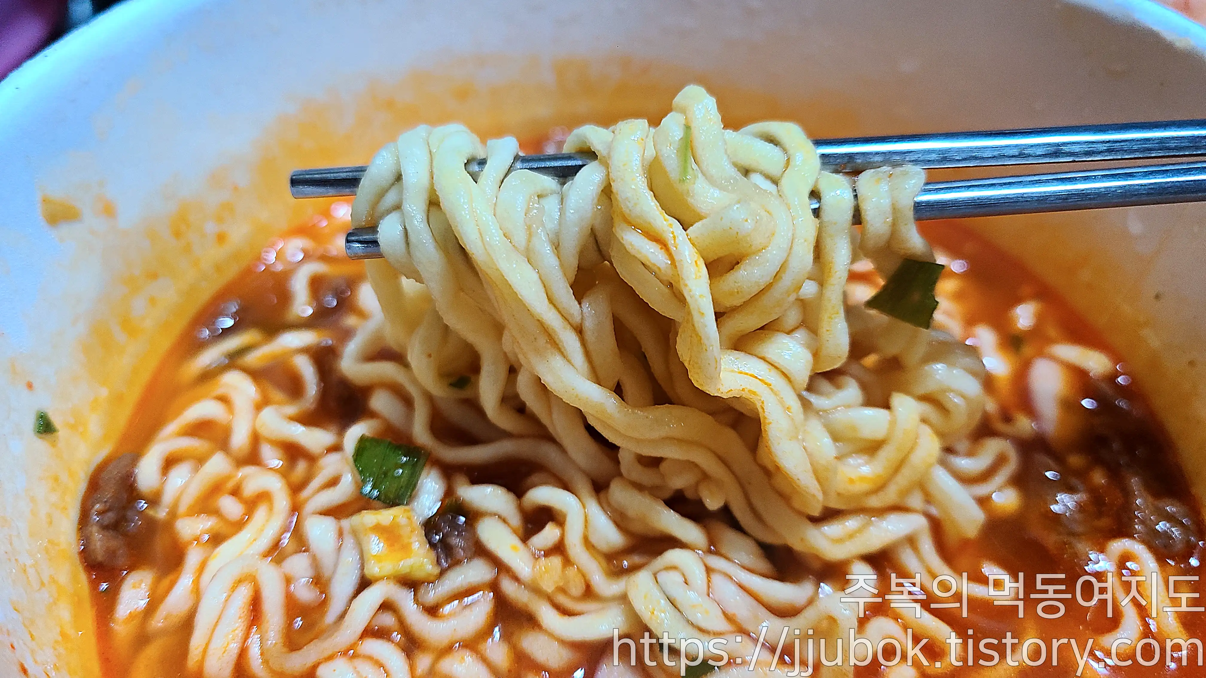 타 컵라면에 비해 면발은 비주얼적으로도 두꺼운데.. 혀 끝으로도 두꺼운 면발의 식감이 느껴지는 맛이라고 할 수 있습니다. 개인적으로 조금 아쉬운 것은 뭔가 면발에 컵라면 국물이 제대로 스며들지 않아서 따로 노는듯한 느낌을 받았다는 것은 제 기분 탓이랄까요?