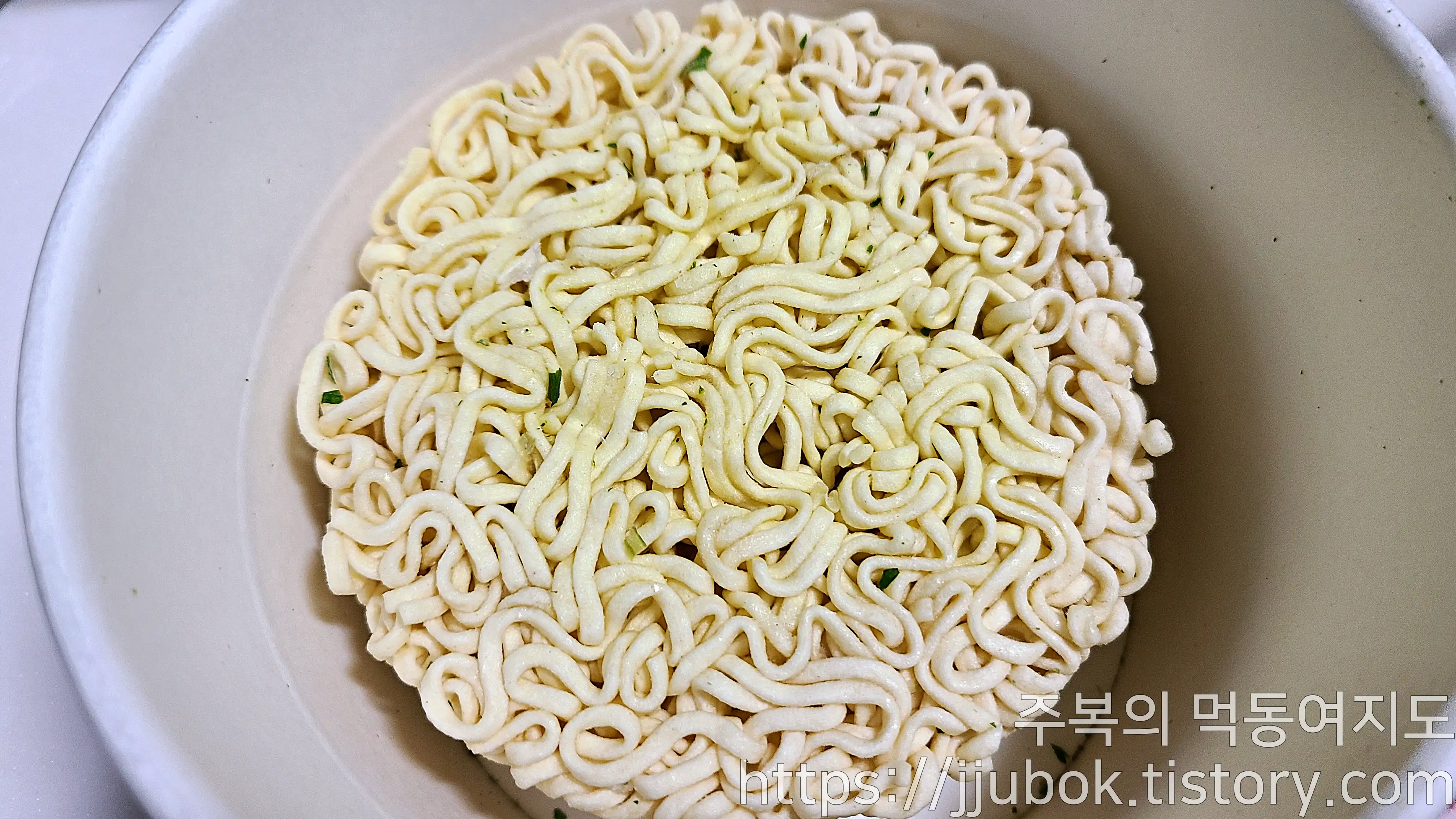 개인적으로 전자레인지 조리가 가능한 컵라면이라고 한다면 개인적으로 전자레인지로 돌려 먹는 것을 선호하는 편인데요! 면발이 컵라면 치고는 조금 두꺼운 편이기도 하고 특히나 그냥 뜨거운 물로만 조리하는 것보다 전자레인지로 조리했을 때 면발이 좀 더 쫀득해지는 느낌인 것 같습니다.